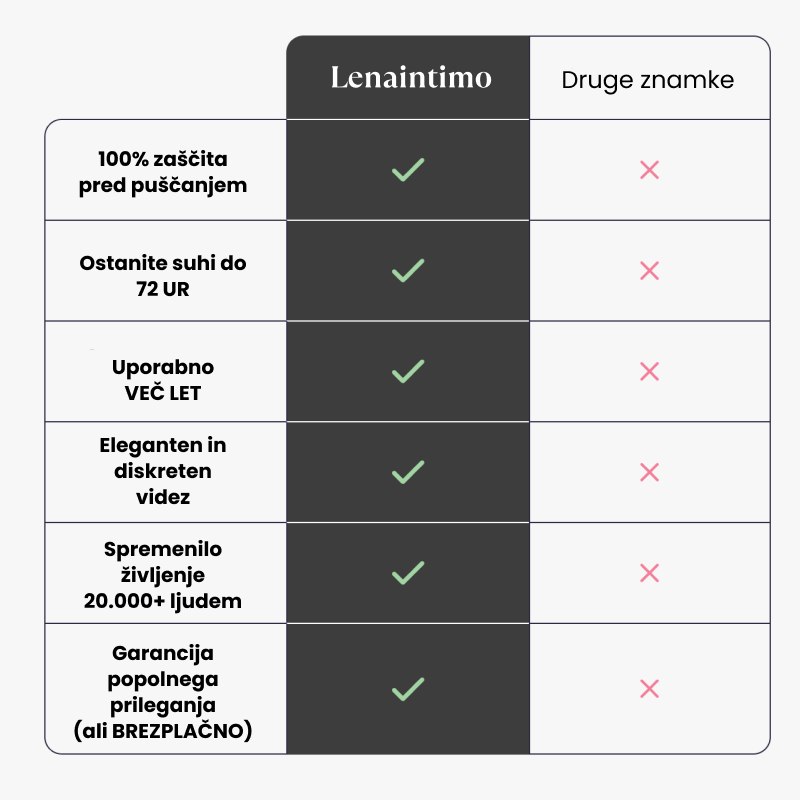 Lenaintimo smo zasnovali tako, da prekaša običajno neprepustno spodnje perilo po udobju, zaščiti in samozavesti. Tako se primerjamo.